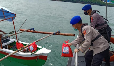 “Bahan pokok tersebut disalurkan anggota Ditpolairud Polda Banten di Perairan Suralaya Merak, pemberian paket Sembako tersebut langsung diberikan personel di atas perahu yang sedang mencari ikan.” terang Kombes Pol Heri.