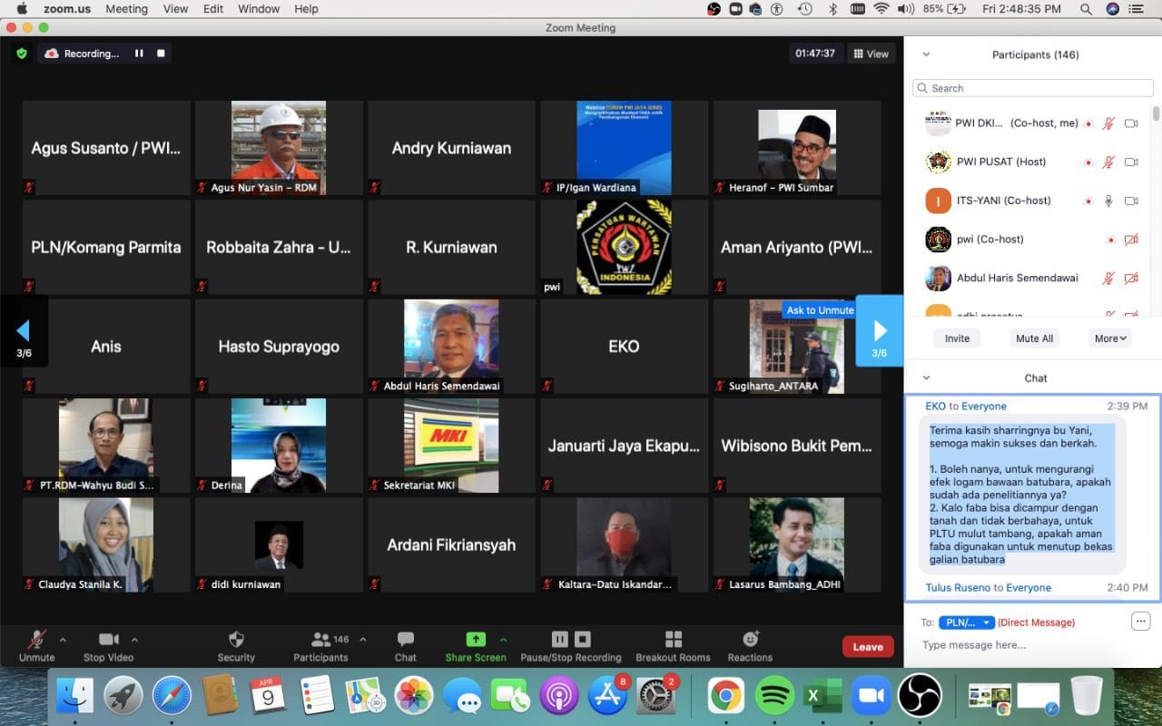 Webinar yang juga disajikan secara live melalui facebook PWI DKI Jakarta ini menampilkan empat pembicara. Yakni, Sri Andini, Komisaris Utama PT. Bukit Pembangkit Inovative, Dr.Eng Januarti Jaya Ekaputri, ST, MT, Dosen ITS, peneliti pemanfaatan FABA untuk infrastruktur, Dr.Ir.Nani Hendiarti, M.Sc, Deputi Bidang Koordinasi Pengelolaan dan Lingkungan dan Kehutanan Kemenko Kemaritiman dan Investasi, serta Prof.Dr.Ir.H Fachrurrozie Sjarkowi, M.Sc, Akademisi Masalah Lingkungan Hidup. Diskusi menarik ini dipandu oleh Brigita Manohara, presenter TvOne.