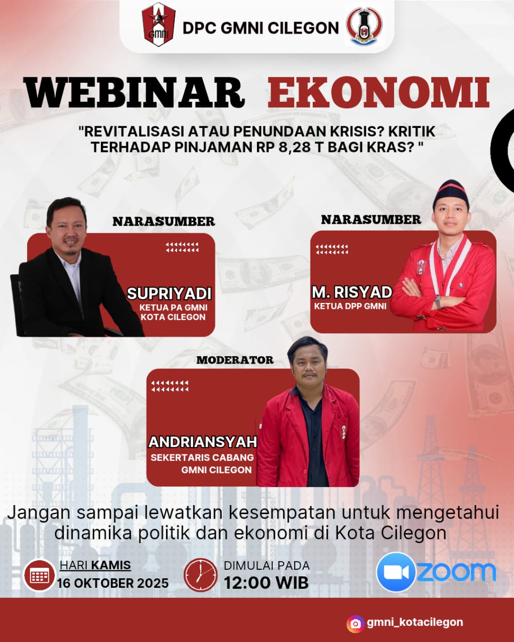 Webinar ini dihadiri oleh para kader GMNI Cilegon dan menghadirkan Ketua Umum DPP GMNI Muhammad Risyad, sebagai narasumber utama yang memberikan pandangan ideologis dan strategis terkait kebijakan industri nasional dan restrukturisasi BUMN strategis seperti Krakatau Steel.