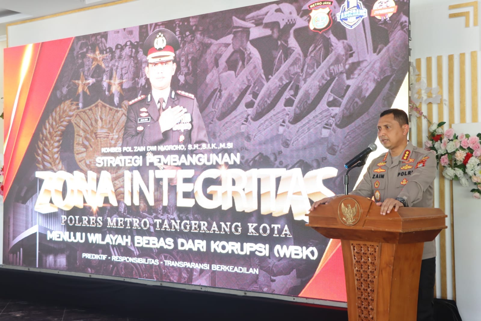 Dalam sambutannya Kombes Zain menjelaskan bahwa Zona Integritas merupakan wujud nyata Reformasi Birokrasi di instansi Polri, dalam rangka peningkatan kualitas dan kemudahan pelayanan publik, maka kabar baiknya kini berbagai pelayanan di Mapolres Metro Tangerang Kota hampir seluruhnya sudah berbasis Informasi Tekhnologi (IT).