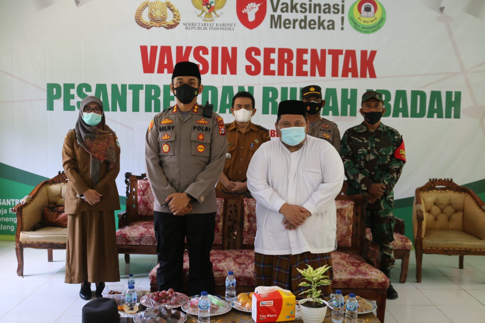 Pandeglang’LN – Kapolres Pandeglang AKBP Belny Warlansyah, S.H.,S.IK, M.H melakukan pengecekan pelaksanaan vaksinasi serentak pesantren dan rumah ibadah yang bertempat di Ponpes Al-Mumin Kp. Leuwimuja Rt.002/005 Ds. Sukaseneng Kec. Cikeusik dalam rangka Percepatan Vaksinasi, Selasa (7/9/2021)