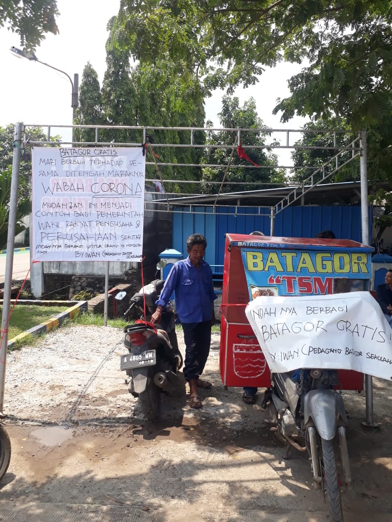 “Biasanya jualan berkeliling atau mangkal di sekolah, kini tidak bisa lagi karena wabah virus covid -19,” ujar Iwan, disela-sela aksinya membagi-bagikan batagor gratis kepada setiap orang yang lalu lalang. Kamis (9-4-2020).