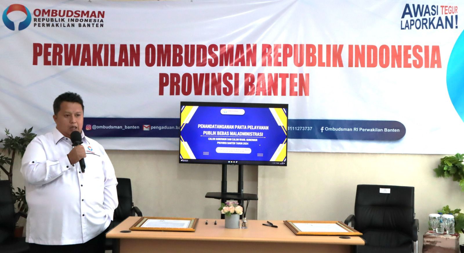Serang, LN – Sebagai salah satu upaya mengejawantahkan komitmen para calon pemimpin daerah di Provinsi Banten, Perwakilan Ombudsman Republik Indonesia Provinsi Banten mengundang para Calon Gubernur dan Calon Wakil Gubernur Provinsi Banten tahun 2024 untuk menandatangani Pakta Pelayanan Publik Bebas Maladministrasi (PPBM), hari ini, di kantor Perwakilan Ombudsman RI Provinsi Banten, Lontarbaru, Kota Serang.