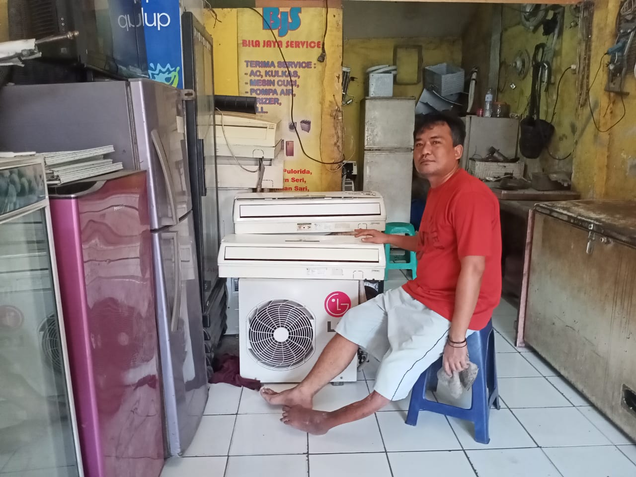 Beliau adalah Yaman, karyawan sebuah kios jasa servis eloktrinik AC dan kulkas di daerah Merak.